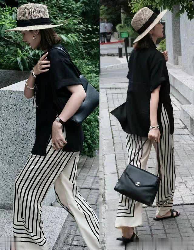 黑白条纹的阔腿裤,看上去显瘦又提辨识度,配合黑色衬衫,还能烘托出几分高级的冷淡感,很显气质魅力。