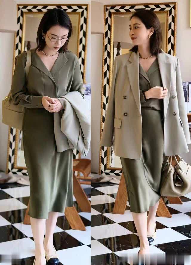 运用了这种穿法,以小西装与连衣裙组合出了英气又优雅的视觉风格,上身效果简单又提气质,非常实用。