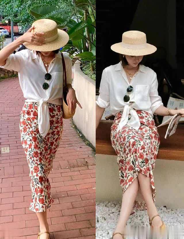 像这件清爽感十足的白色衬衫,大部分人都可以能够得心应手的搭配出OOTD,但是比起那些过于单调的穿法,中年女人也可以试试配碎花半身裙的公式,可以彰显出主次分明的既视感,在清新与浪漫中取得平衡点。