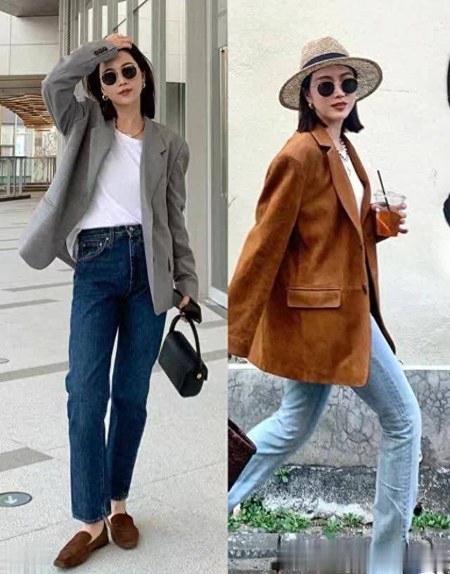 比方说图中这类小西装,显然就是比较典型的基础款设计,而为了消除这种一本正经的风格,牛仔裤就是它最好的搭档。