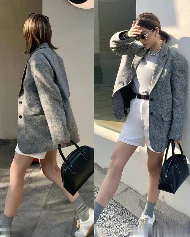 灰色西服外套,就运用了白色短裤来匹配,不仅下装配色足够清爽,再加上构造出的露肤面积,都可以给造型带来酷飒却不死板的中性风采。